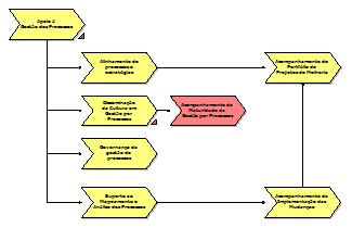 Inicia com a avaliação das estratégias em relação à cadeia de valor dos processos e termina com o acompanhamento da mudança. Abrir subnível Abrange os processos envolvidos no planejamento de capacitação e promoção de eventos voltados a icriação de uma cultura com orientação para processos. Compreende as atividades envolvidas ao acompanhamento da implementação das mudanças identificadas como necessárias na análise dos processos e o respectivo desempenho. Compreende as atividades envolvidas no suporte ao mapeamento, análise e definição dos indicadores de acordo com as diretrizes, métodos e ferramentas estabelecidas pela governança.